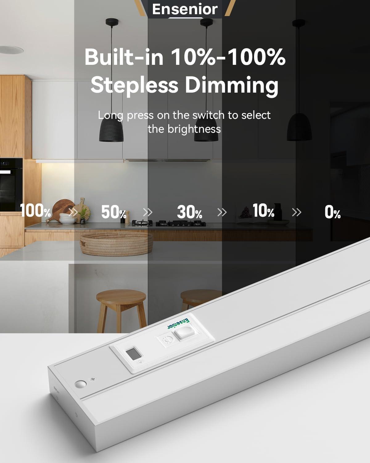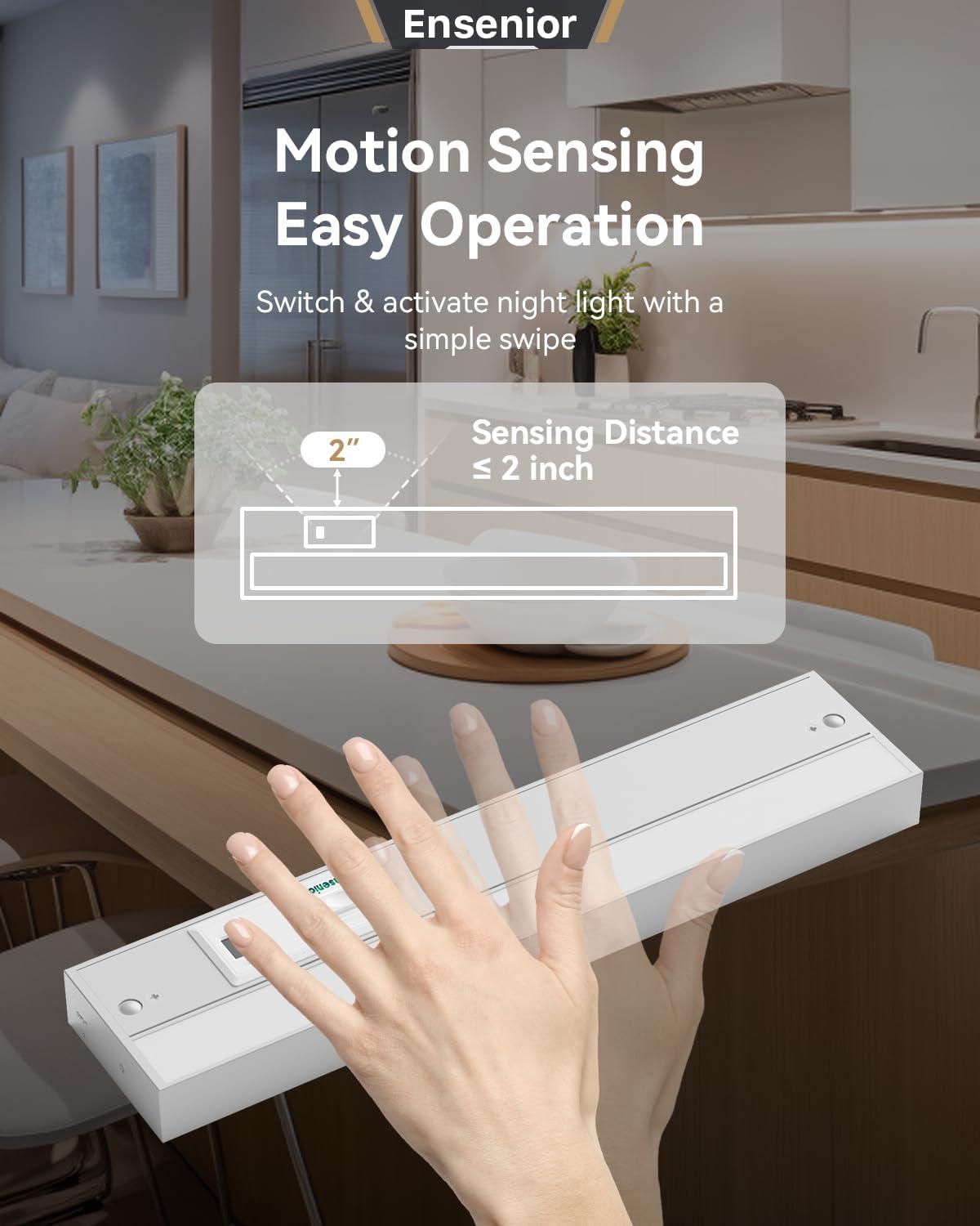 Motion sensor under cabinet lighting: Hands-free operation with dirty or wet hands. Wave within 2 inches to control. One wave restores last brightness; two quick waves switch to ultra-low night-light mode. If on over 10 seconds, one wave turns it off—no touch needed. Motion activated under cabinet lights for seamless, hygienic use