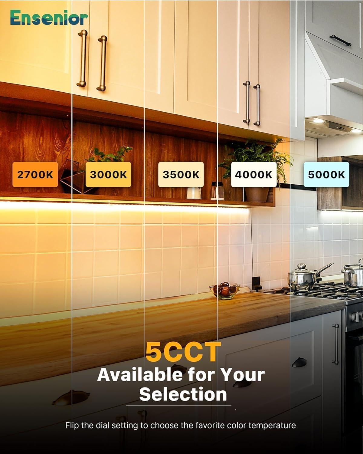 Kitchen lights with 5 CCT Stepless Dimming: Customize your cabinet lights with 5 selectable color temperatures—from warm to cool white—to match any mood or task. Enjoy smooth, stepless dimming from 10% to 100% brightness, perfect for versatile kitchen lighting needs