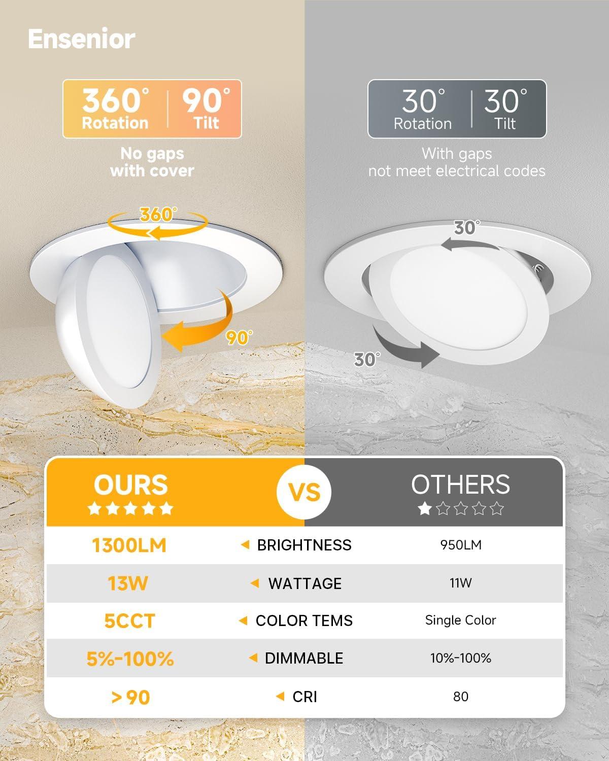 Be the first to review “Ensenior 12 Pack 4 inch 5CCT LED Gimbal Led Recessed Light with Junction Box, 360°+90° Adjustable Directional Eyeball Lighting, Dimmable, 2700K/3000K/3500K/4000K/5000K, 950LM, 10W=85W-ETL&FCC(6 Inch)”