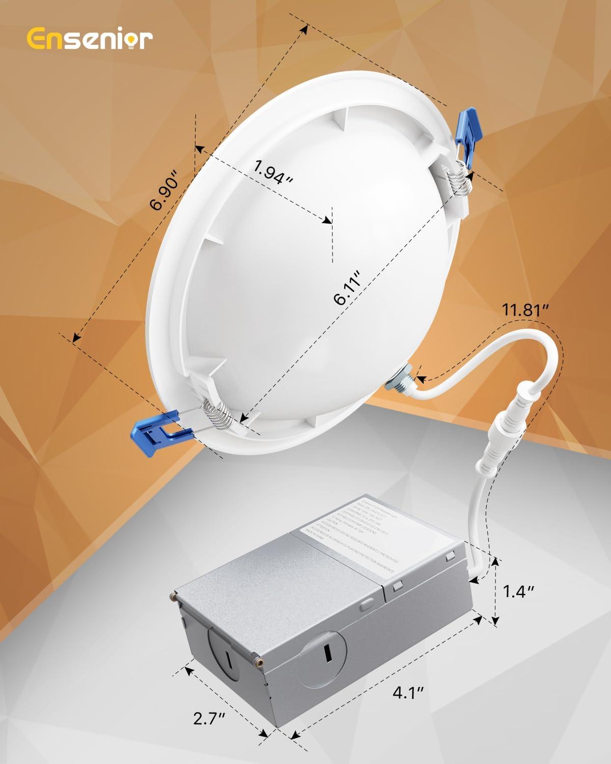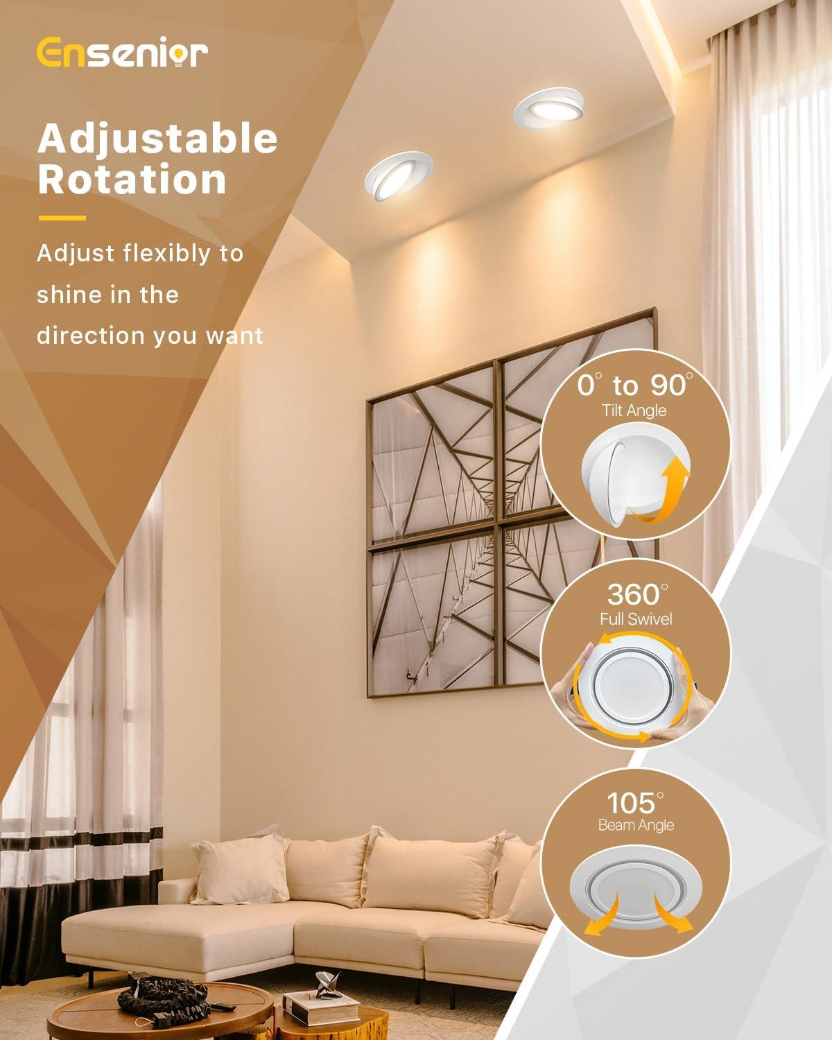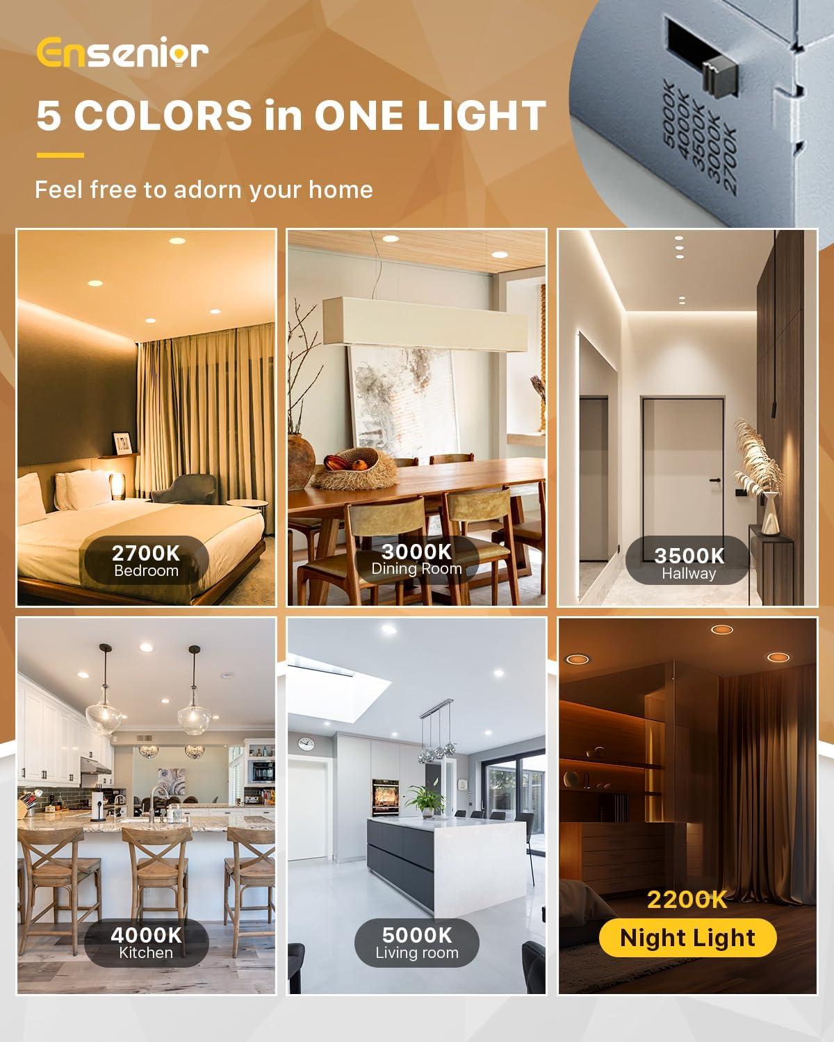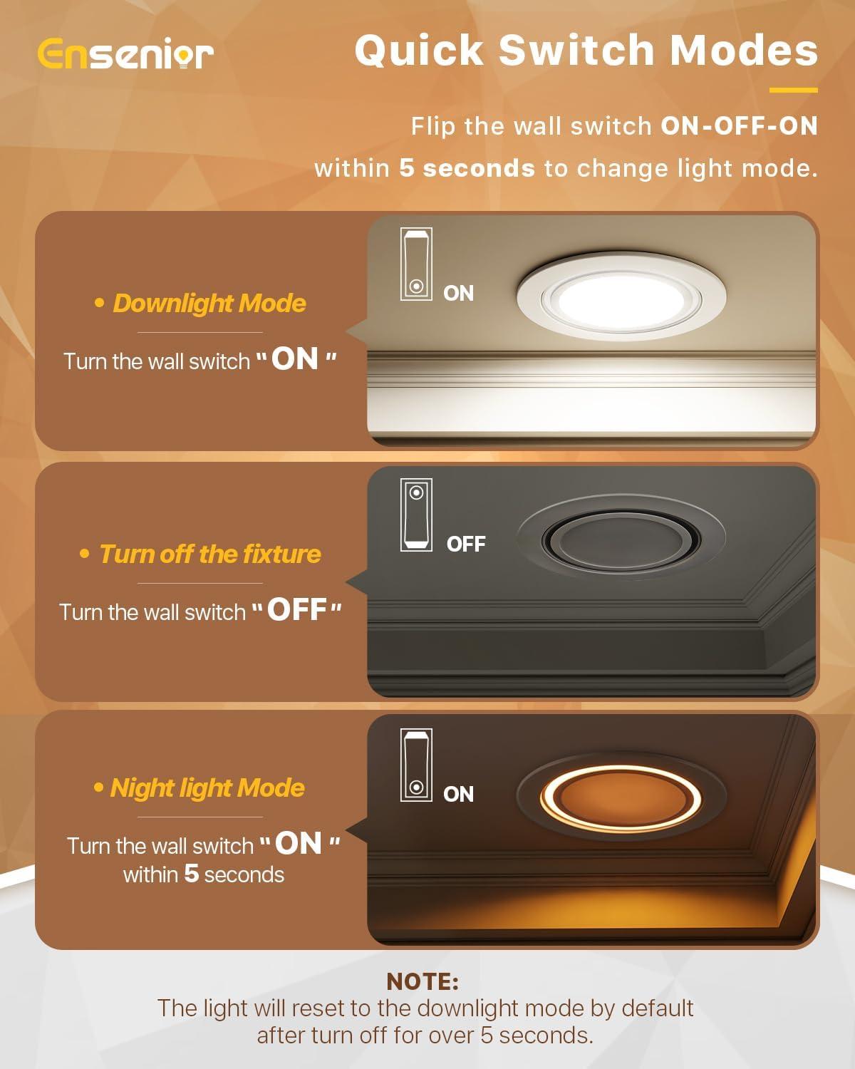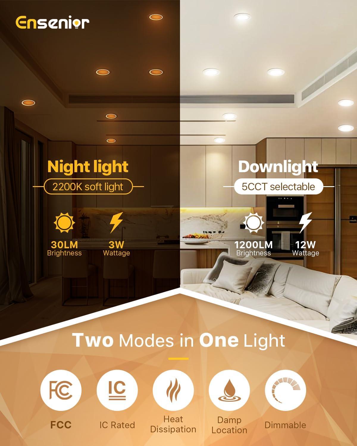 Two Modes in One Light: Ensenior 6 inch gimbal led recessed lights with night light can provide two modes in one light, which can be switched by wall switch-2200K night light mode and 5CCT downlight mode; The nightlight mode provides 2200K soft warm color temperature, creating a cozy, warm and comfortable ambience to help you fall asleep at night.