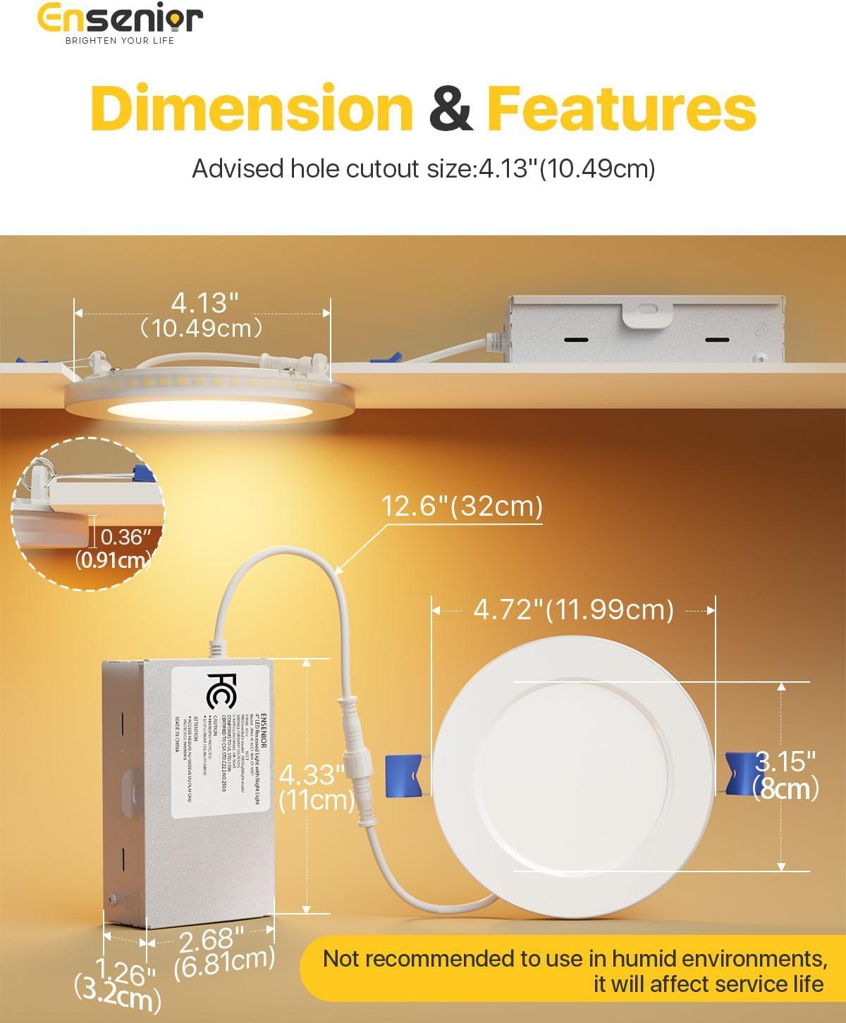 Save up to 40% on Ensenior 12 Pack 6 Inch LED Recessed Ceiling Light with Night Light, Dimmable, 2700K-5000K 5CCT, 1050LM 12W 120V, High Brightness Canless Wafer Downlight – FCC(4 Inch) styles during our end-of-season sale.