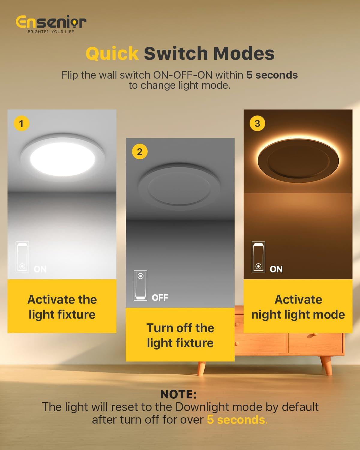 💡【Synchronization Reset Function】Every time when you turn on the light, it will automatic reset to downlight mode. If the lights are in different modes, you could turn the wall switch off for over 5 seconds and turn on again to synchronize the lights to downlight mode, or turn it off and on in 5 seconds to Night light mode.