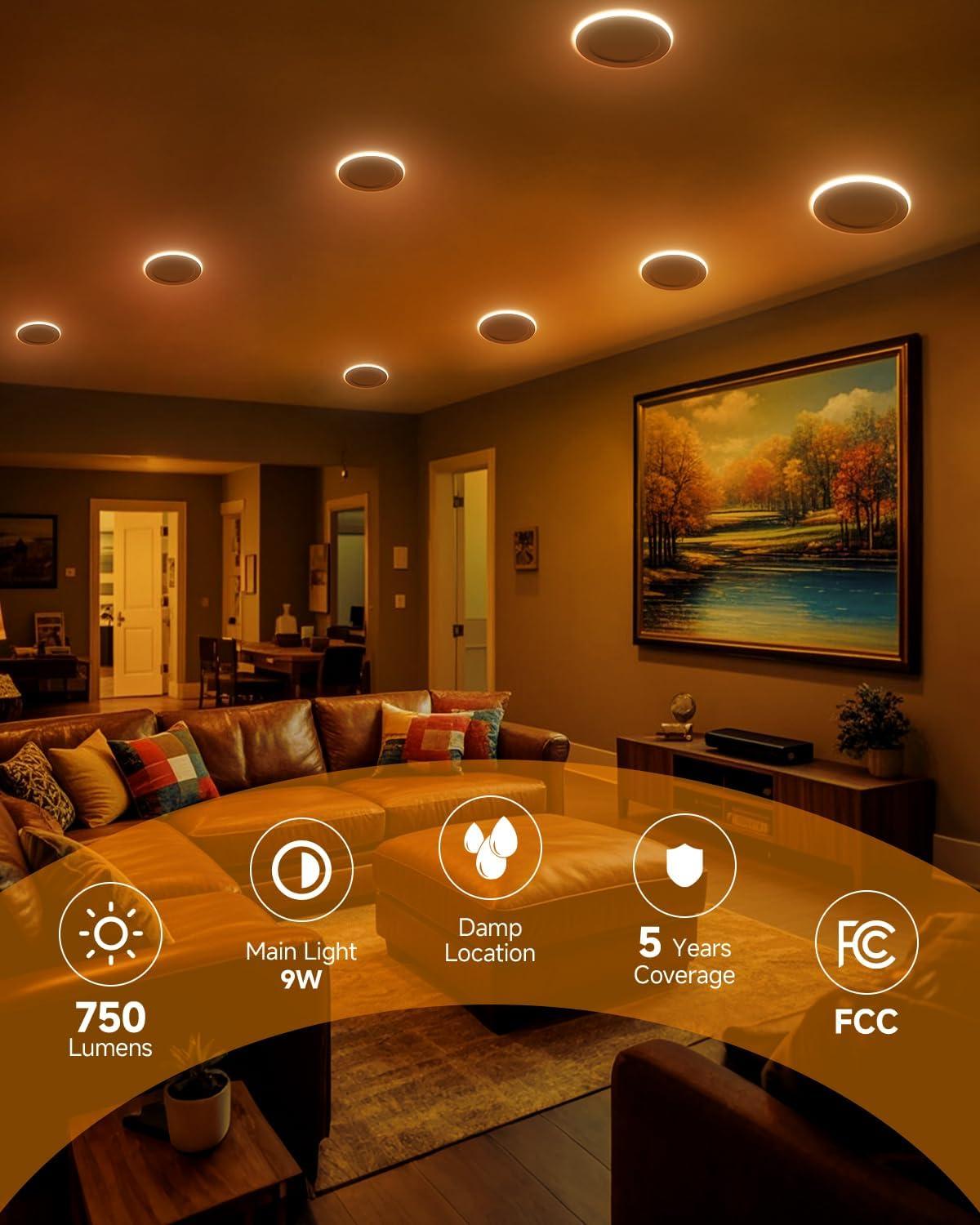 💡【Enhanced Night Light】Our 6 inch LED recessed lighting features a built-in night light that emits a soft 2700K amber glow on the trim of the downlight. It's perfect for providing convenient, glare-free lighting during nighttime.