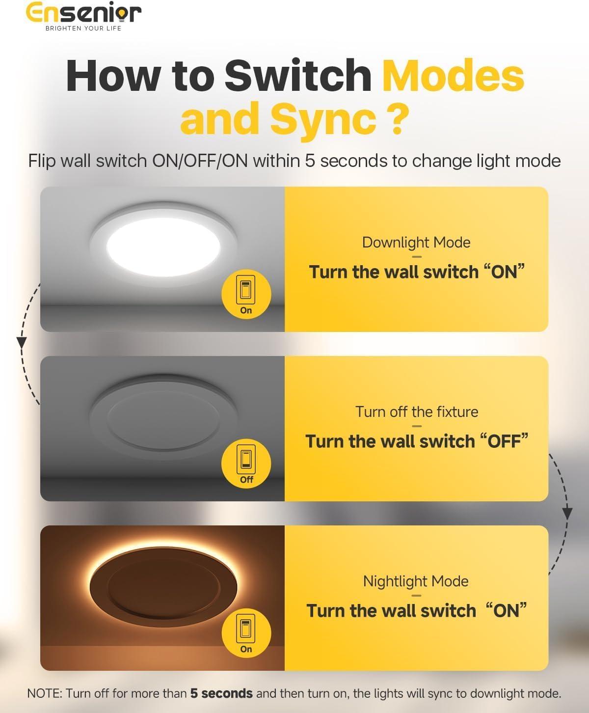 💡【Synchronization Reset Function】Every time when you turn on the light, it will automatic reset to downlight mode. If the lights are in different modes, you could turn the wall switch off for over 5 seconds and turn on again to synchronize the lights to downlight mode, or turn it off and on in 5 seconds to Night light mode.