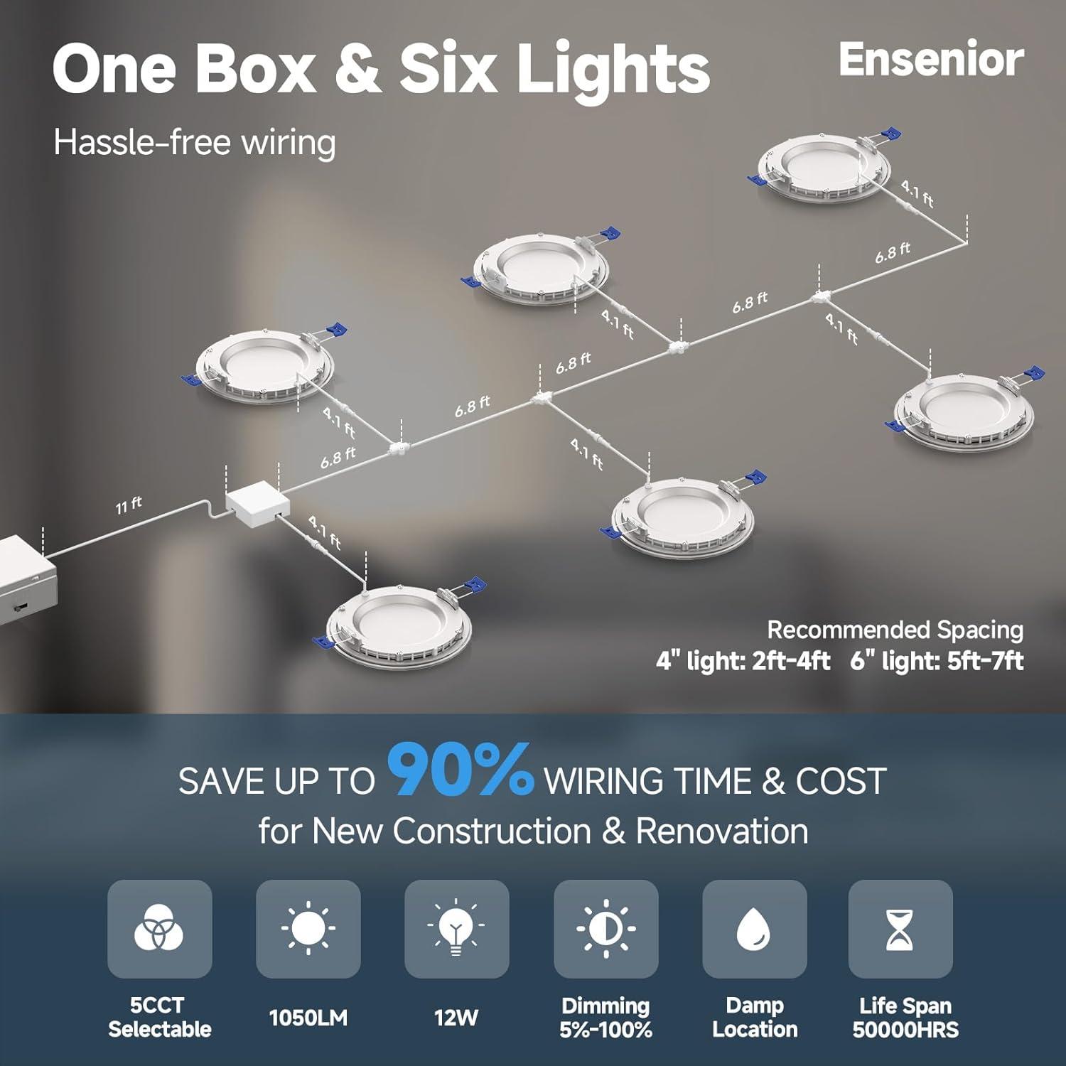 CENTRAL DESIGN: Up to 6 Ensenior 5CCT led recessed lights can be connected to one central junction box through the pre-wired spliters. It cut off 90% cost of time and DC wiring. Note: Please check that the light you expect to install is within the wire range.