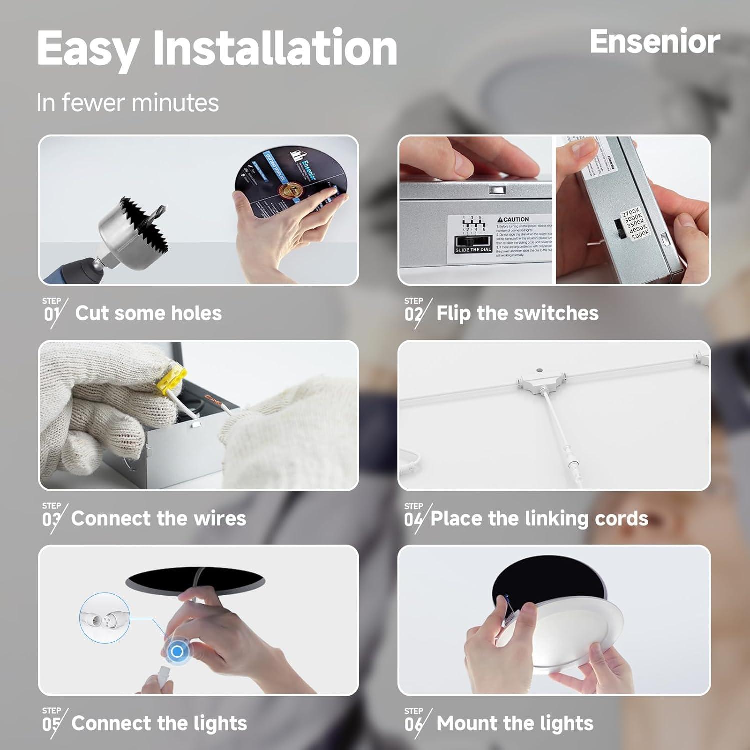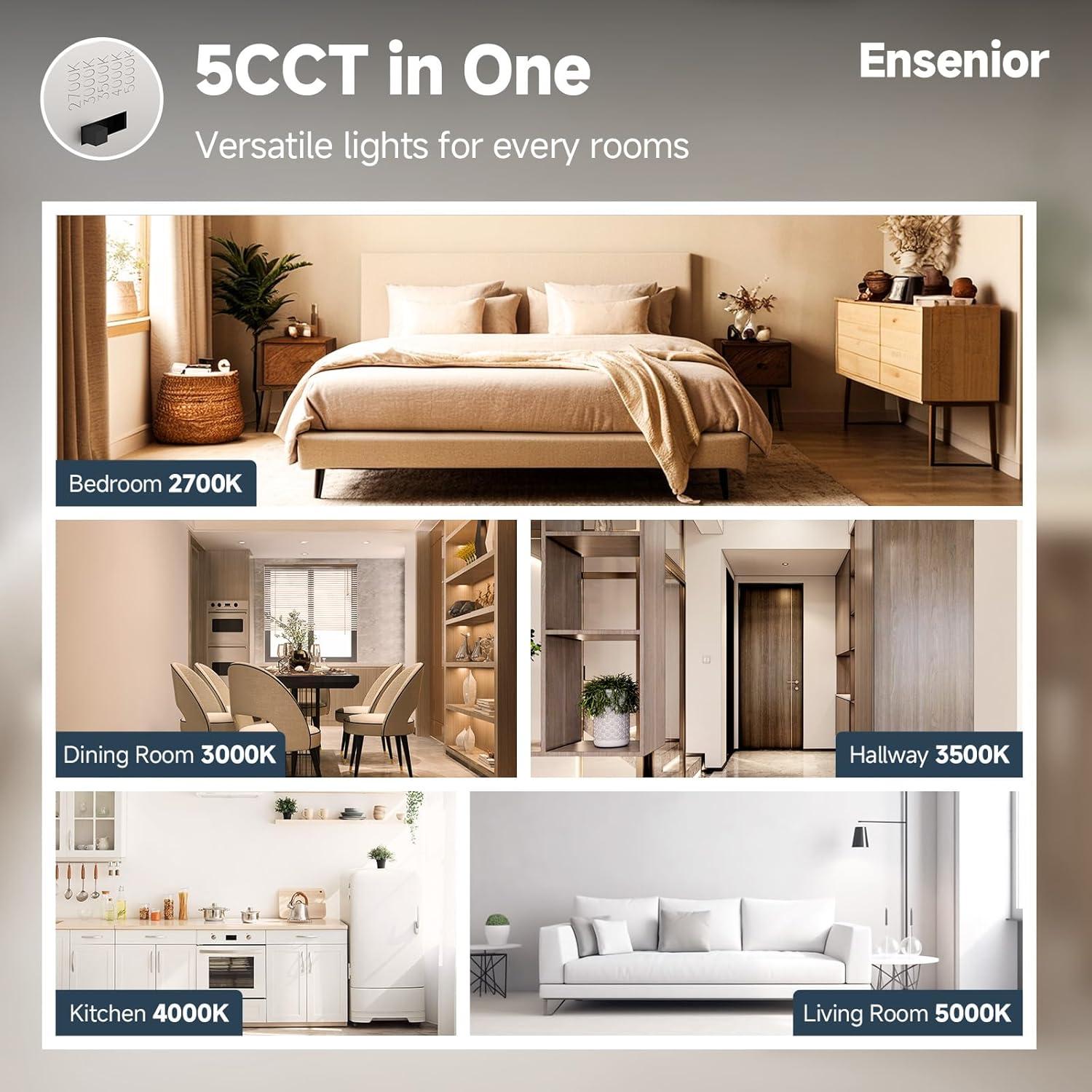5CCT in ONE: Choose from 2700K, 3000K, 3500K, 4000K, 5000K with a simple click on the side of the J-box, Ensenior's recessed light provides perfect lighting for your bedroom, living room, kitchen, bathroom, home office, hallway and other rooms.