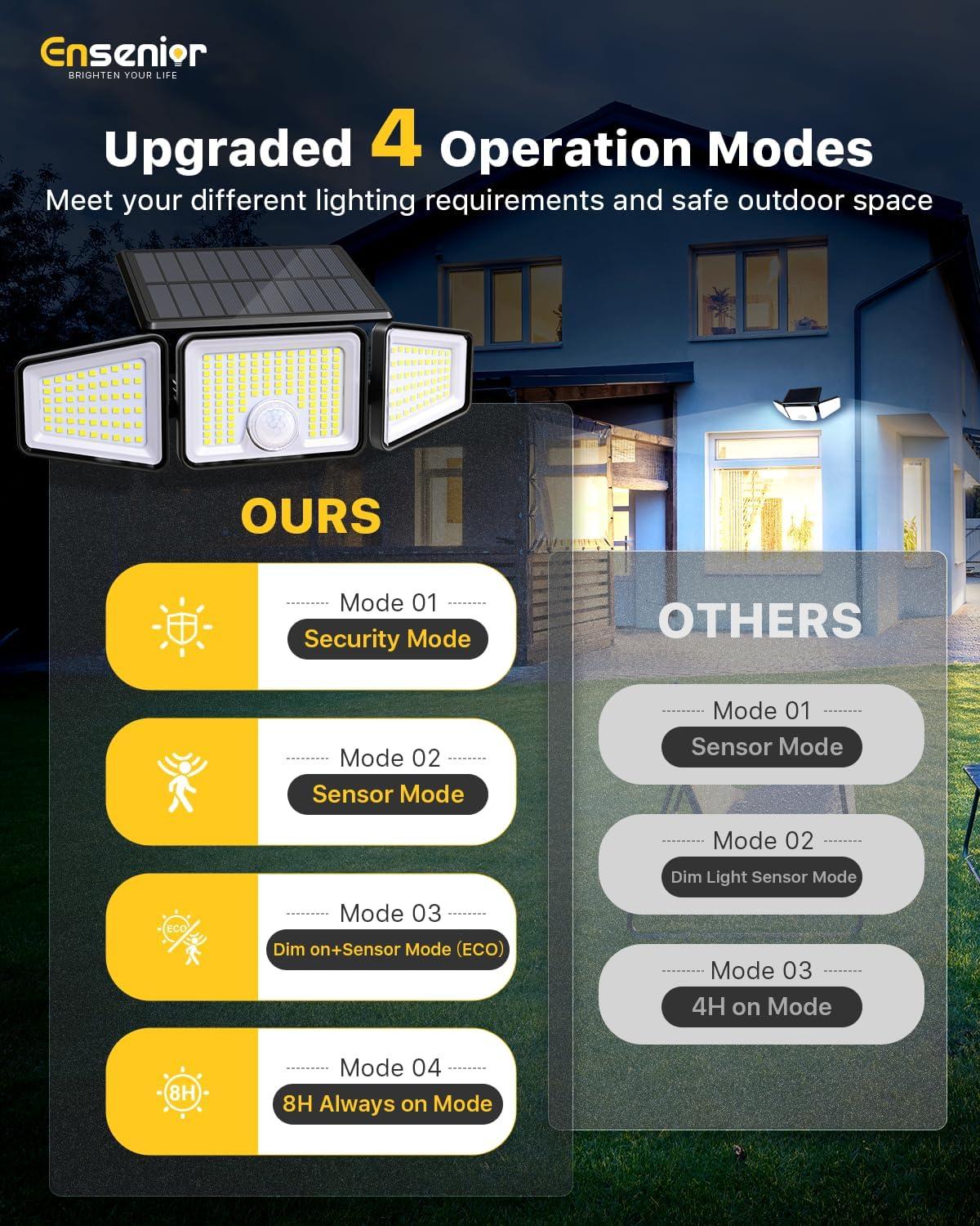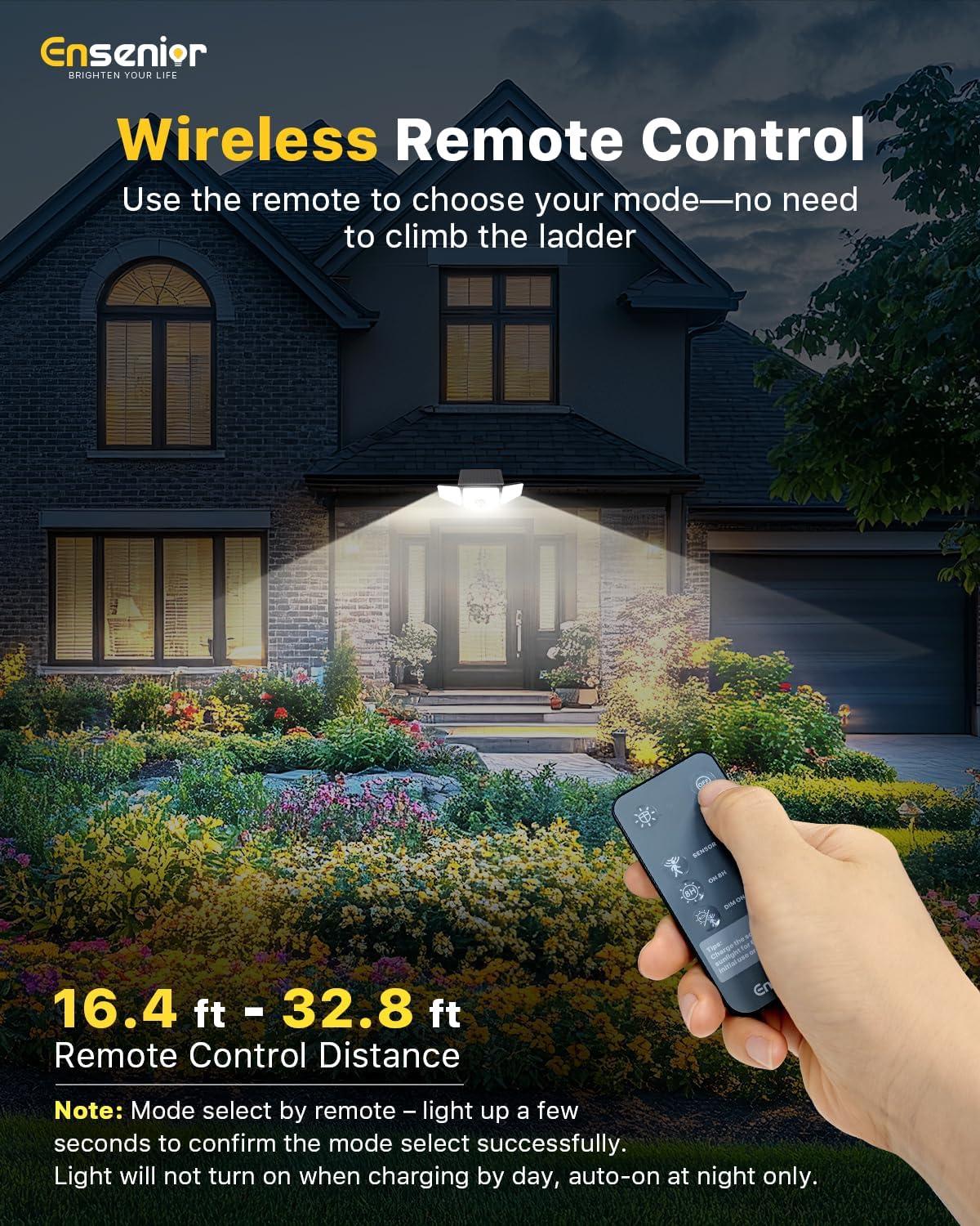 Upgraded 4 Modes & Remote Comtrol: Our solar security lights offer 4 working modes: Security Mode, Sensor Mode, Dim on + Sensor Mode (ECO) & 8H Always On Mode. With remote control or buttons on the light, you can easily switch to the best mode for your daily lighting needs