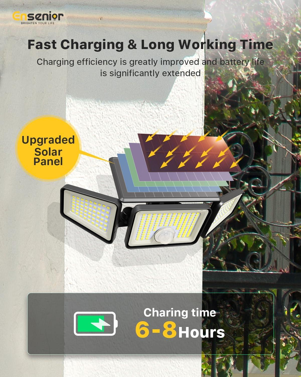 Upgraded Solar Panel & Long Working Time: With an upgraded PET polysilicon solar panel, our solar motion sensor outdoor lights offers enhanced durability & corrosion resistance. High-capacity 1800mAh battery allow for 6-8H fast charging & long working time all night