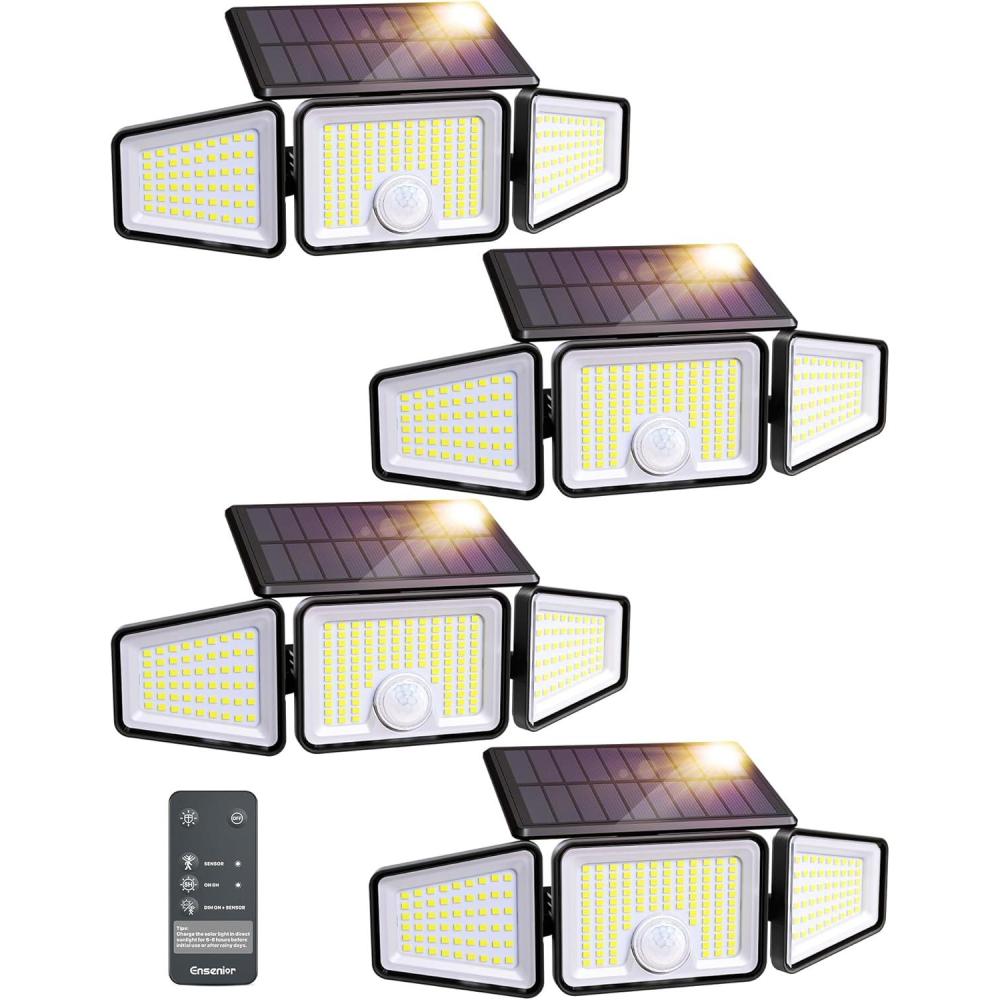 Ensenior Motion Sensor Outdoor Lights, 220 LED IP65 Waterproof Solar Security Light with Remote Control, 3 Heads Solar Flood Light Outdoor with 4 Modes, 270° Wide Angle Motion Light for Outside -3Pack(4Pack)