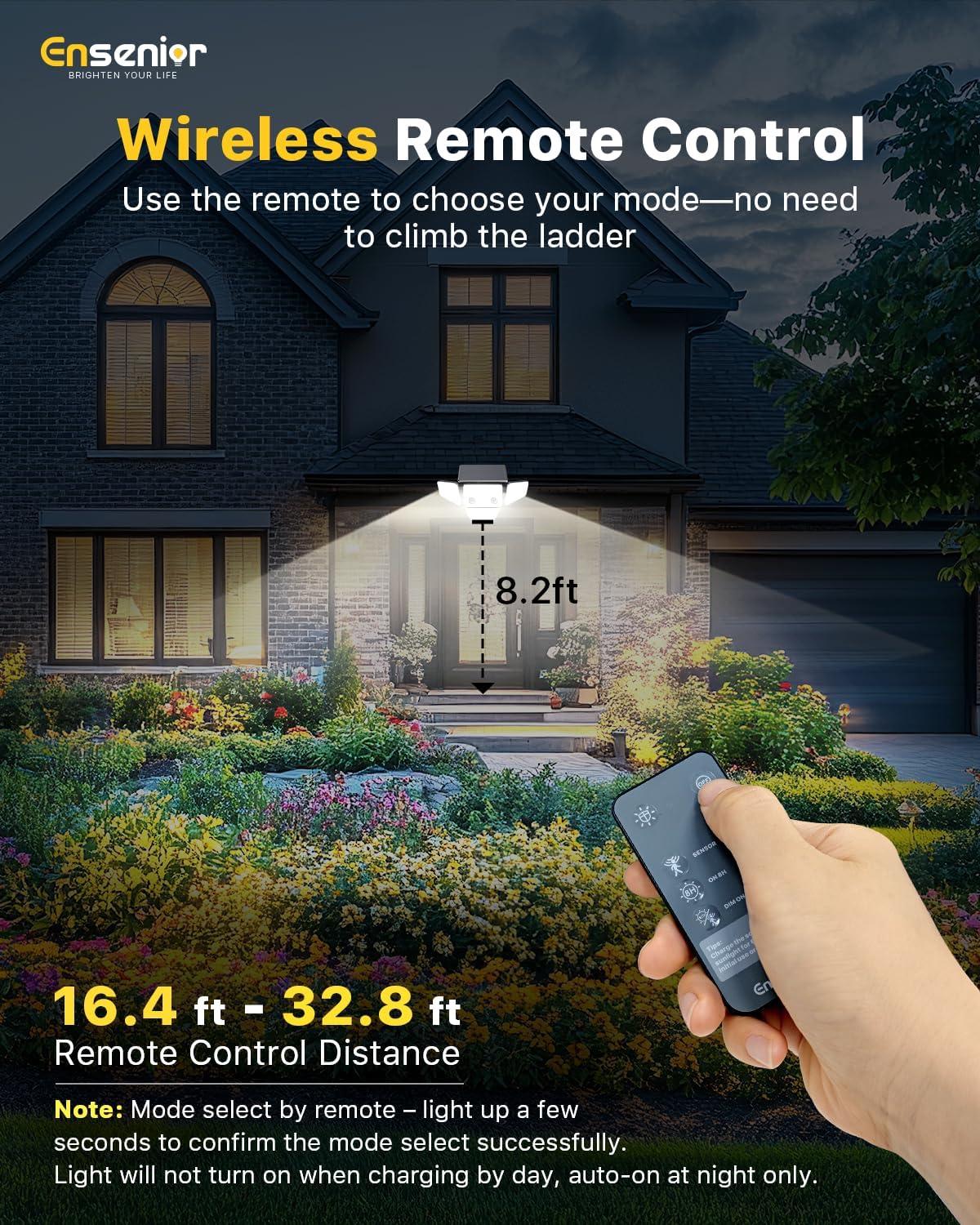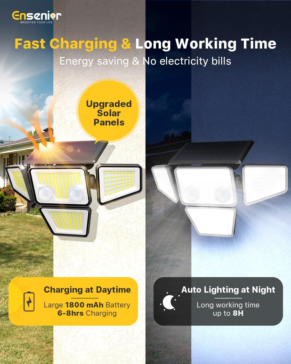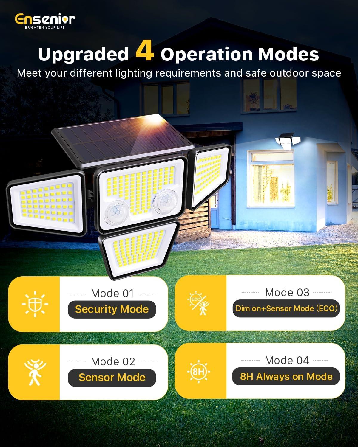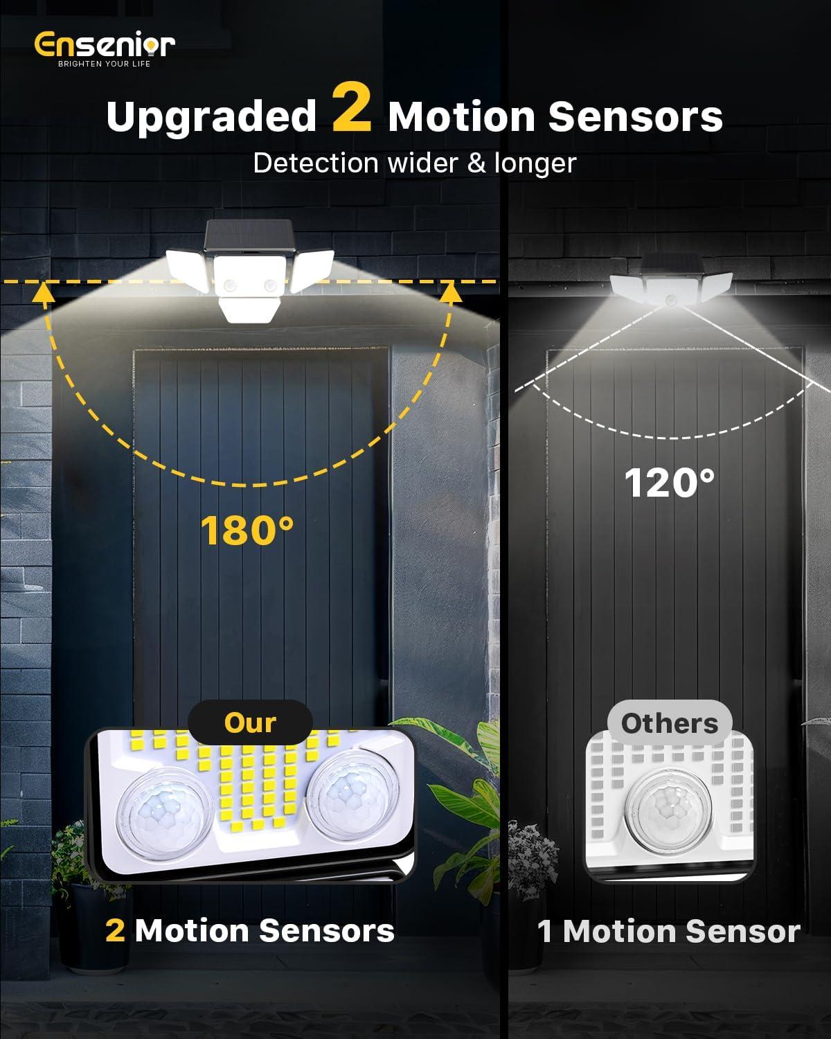 Upgraded Two Motion Sensor: Ensenior solar motion lights outdoor waterproof is equipped two pair motion sensors, poviding a wide detecting angle of 180° degrees and detecting distance of up to 32.8FT. With adjustable 4 heads and a large 270° beam angle, it illuminates wider area with right-angle installation