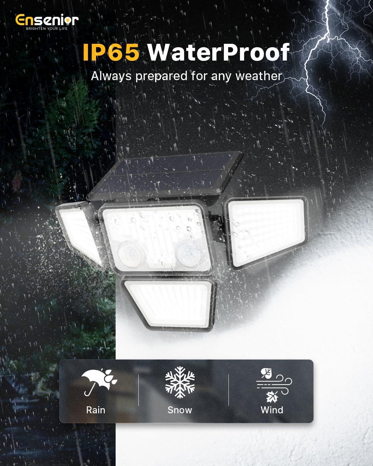 Super Bright & IP65 Waterproof: Ensenior solar flood lights outdoor waterproof equipped with 279 well made LED beads, produce up to 2600LM 6500 K high brightness. IP65 waterproof material ensures it can function well even in heavy rain, snowstorms. Perfectly outdoor solar lights for yard, garden, garage, frence, pathway