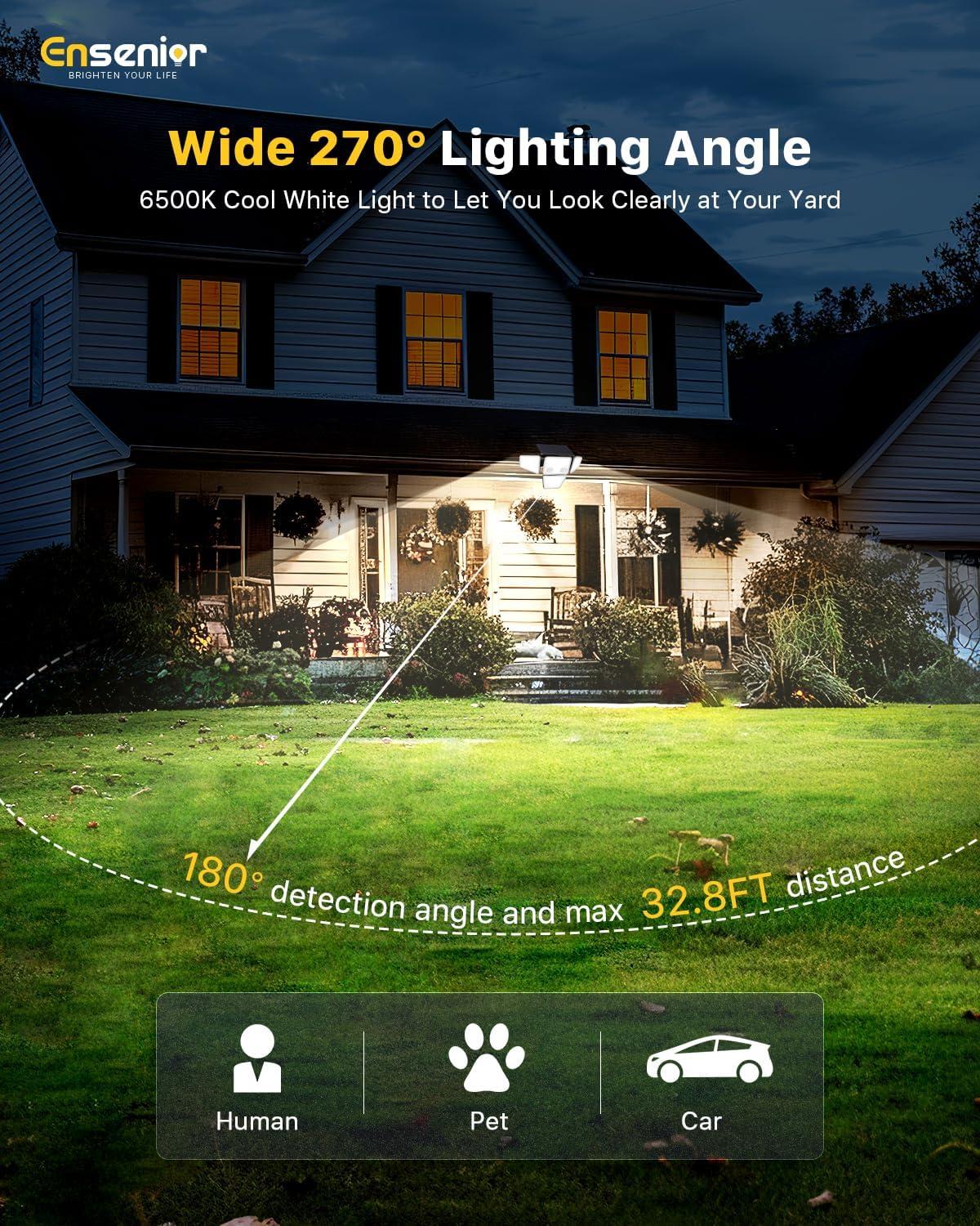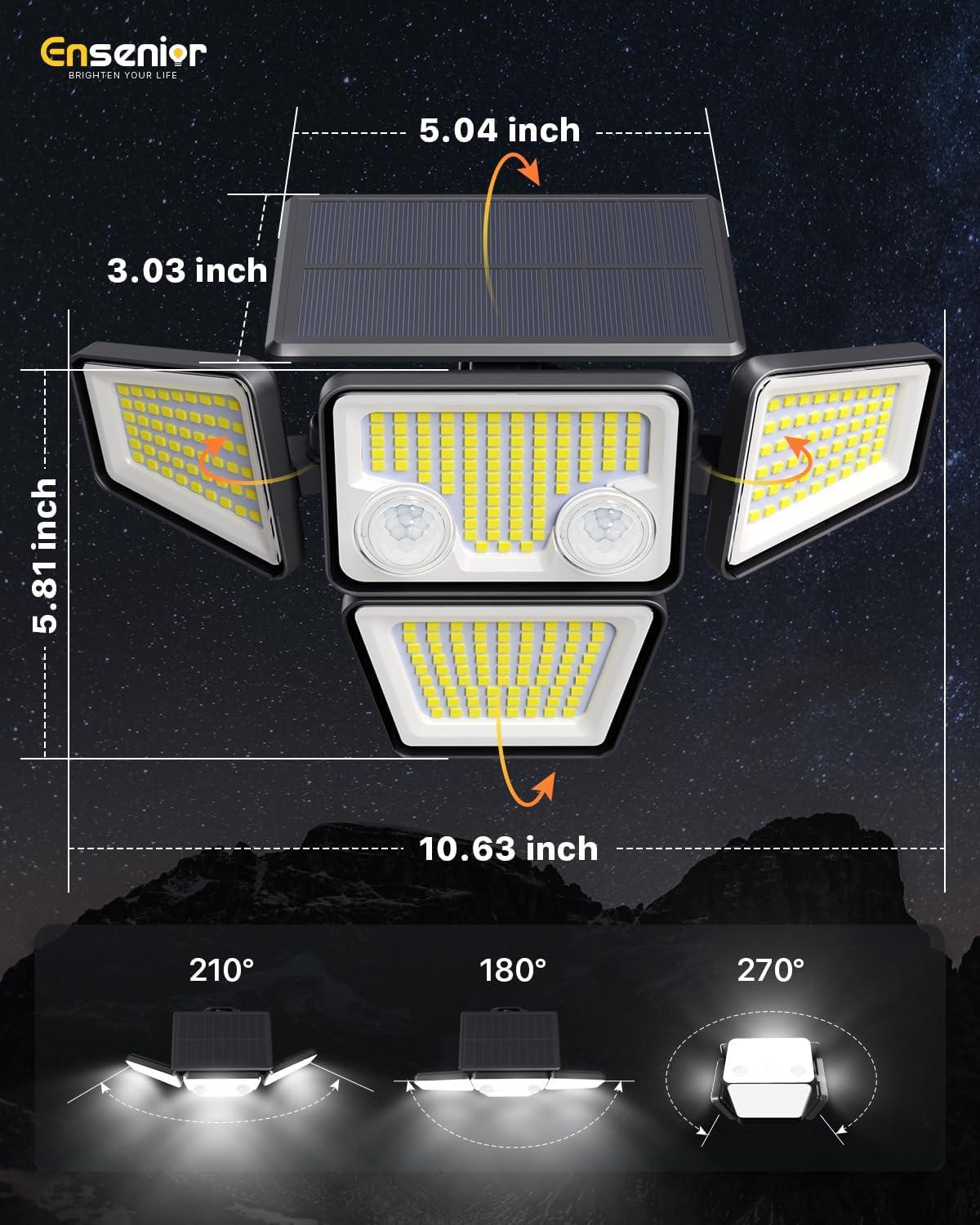 Upgraded Two Motion Sensor: Ensenior solar motion lights outdoor waterproof is equipped two pair motion sensors, poviding a wide detecting angle of 180° degrees and detecting distance of up to 32.8FT. With adjustable 4 heads and a large 270° beam angle, it illuminates wider area with right-angle installation